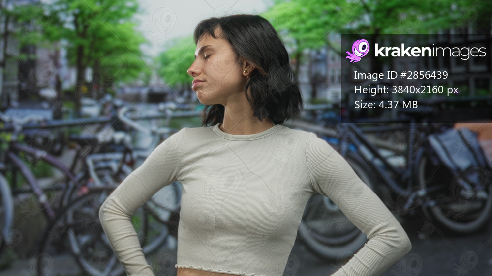Young hispanic woman in a cropped top stands with hand to mouth on a narrow canal street in amsterdam; tiredness.