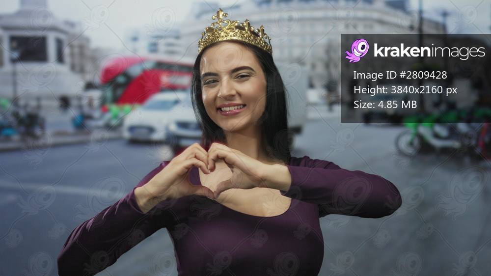 Young hispanic woman in a crown forms a heart with her hands on a busy street, exuding happiness amidst traffic and iconic urban landscape.
