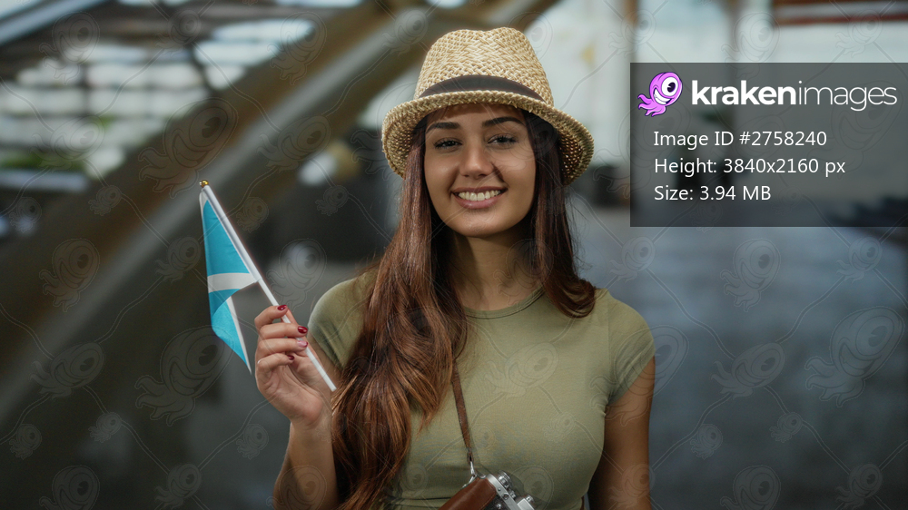 Young hispanic woman in a hotel smiling and holding a scottish flag, wearing a straw hat and green top, suggesting travel and cultural exploration indoors. - Kraken Images