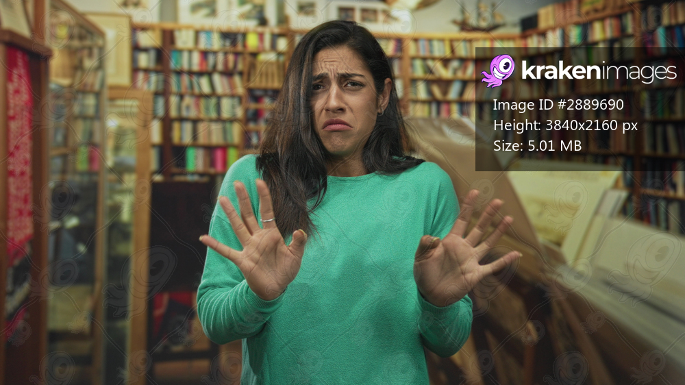 Young hispanic woman in a library with bookshelves, hands raised palms out and grimacing in disgust; disgust avoidance.