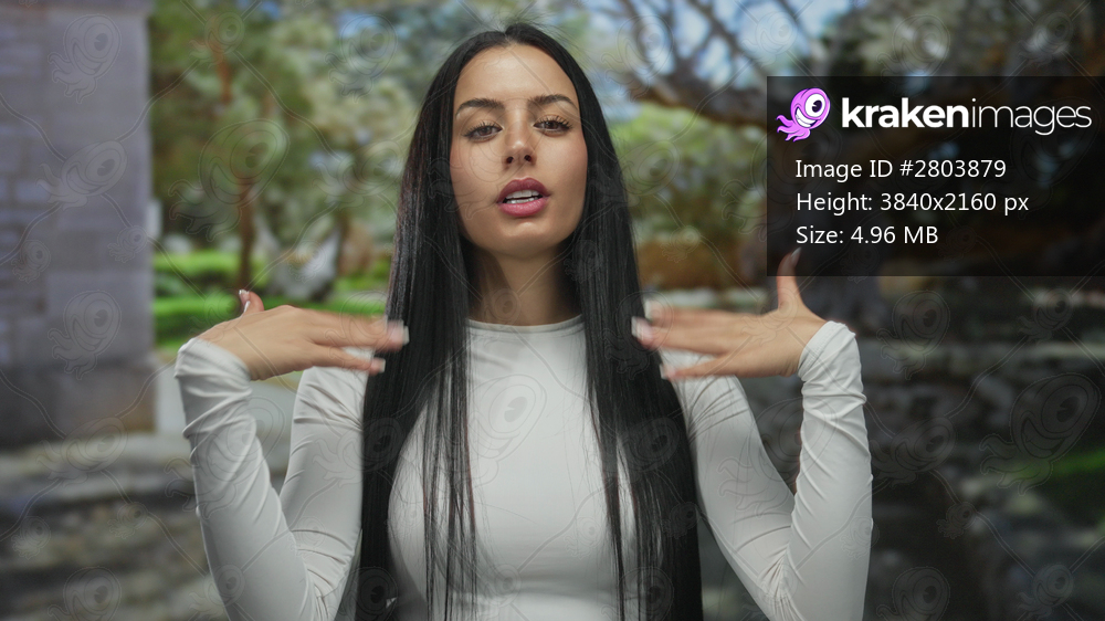 Young hispanic woman in a park fanning herself with hands on a sunny day, surrounded by lush greenery and wearing a casual white shirt, enjoying the outdoor atmosphere - Kraken Images