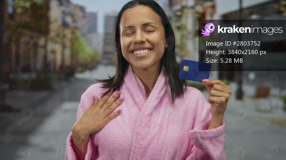 Young hispanic woman in a pink bathrobe holds a credit card smiling confidently in an outdoor urban street setting.