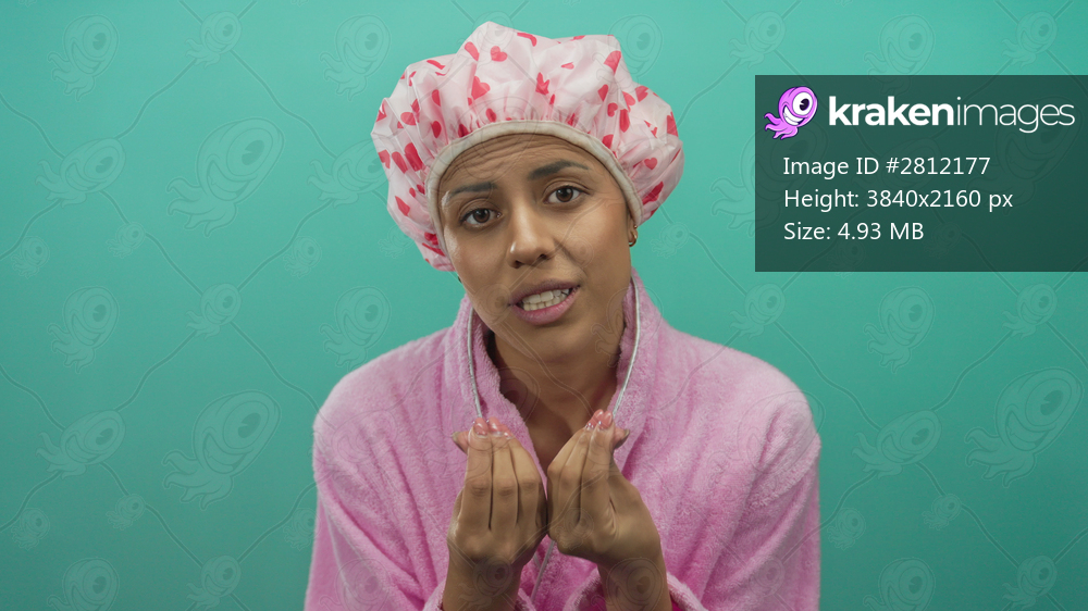 Young hispanic woman in a pink bathrobe and shower cap over an isolated green background makes a hand gesture suggesting a request for money.