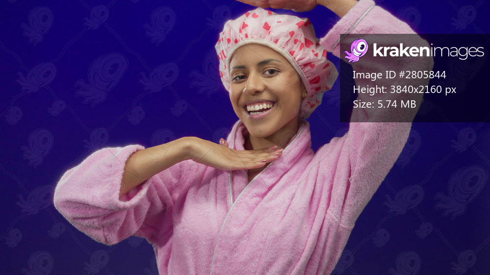 Young hispanic woman in a pink bathrobe smiles while posing against a vibrant blue isolated background, creating a joyful and inviting atmosphere.