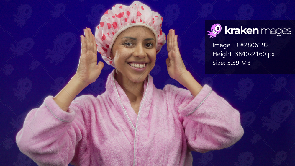 Young hispanic woman in a pink bathrobe smiles while posing against a vibrant blue isolated background, creating a joyful and inviting atmosphere.