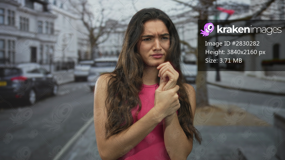 Young hispanic woman in a pink top holds her wrist with a pained frown on a busy street; injury recovery discomfort healing.