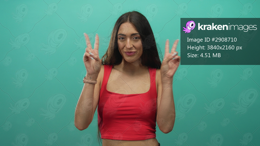 Young hispanic woman in a red crop top flashing peace signs with both hands and visible fingers in a teal studio; joy casual confidence.