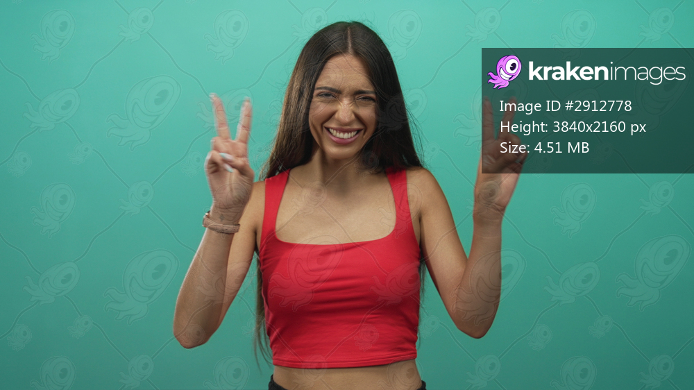 Young hispanic woman in a red crop top flashing peace signs with both hands and visible fingers in a teal studio; joy casual confidence.