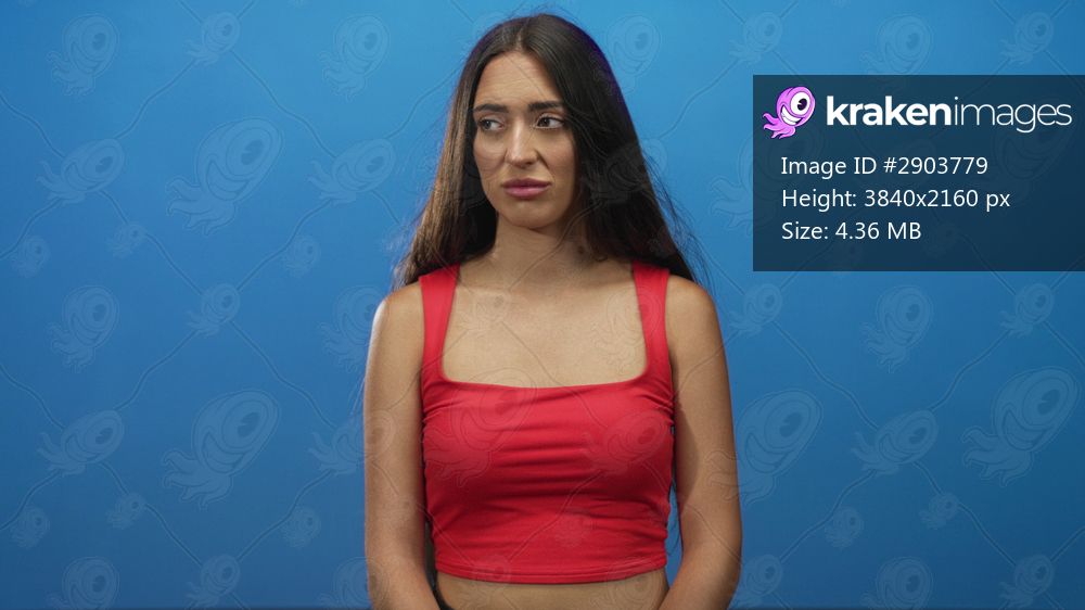 Young hispanic woman in a red crop top glances sideways with a skeptical frown in a blue studio; skepticism.