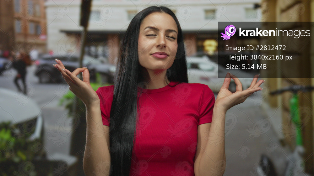 Young hispanic woman in a red shirt meditates with closed eyes on a busy city street, surrounded by cars and urban architecture, conveying peace amid urban chaos. - Kraken Images
