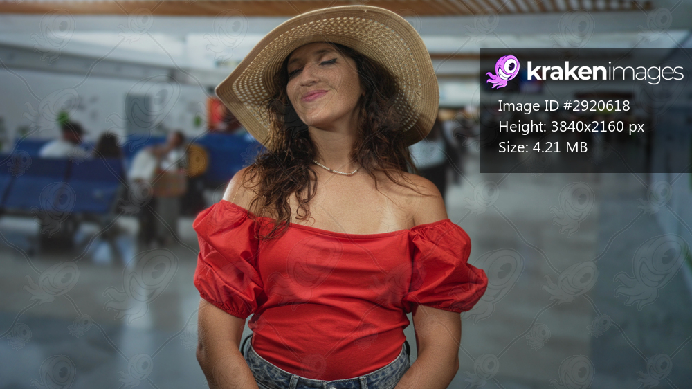 Young hispanic woman in a straw sunhat smiles with bare shoulders and tilted head in an airport terminal; contentment travel.