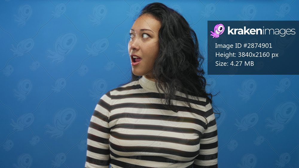 Young hispanic woman in a striped turtleneck smiling and giving thumbs up gesture in blue studio; playful confidence.
