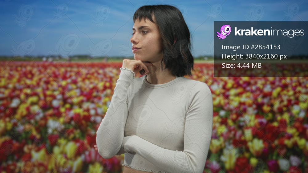 Young hispanic woman in a vibrant flower field forest touches her chin with one finger under clear blue sky; curiosity.