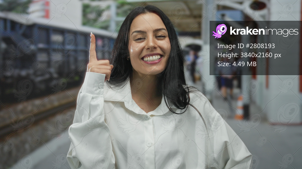 Young hispanic woman in a white shirt smiling and pointing upwards at an outdoor train station, set against blurred railway background.