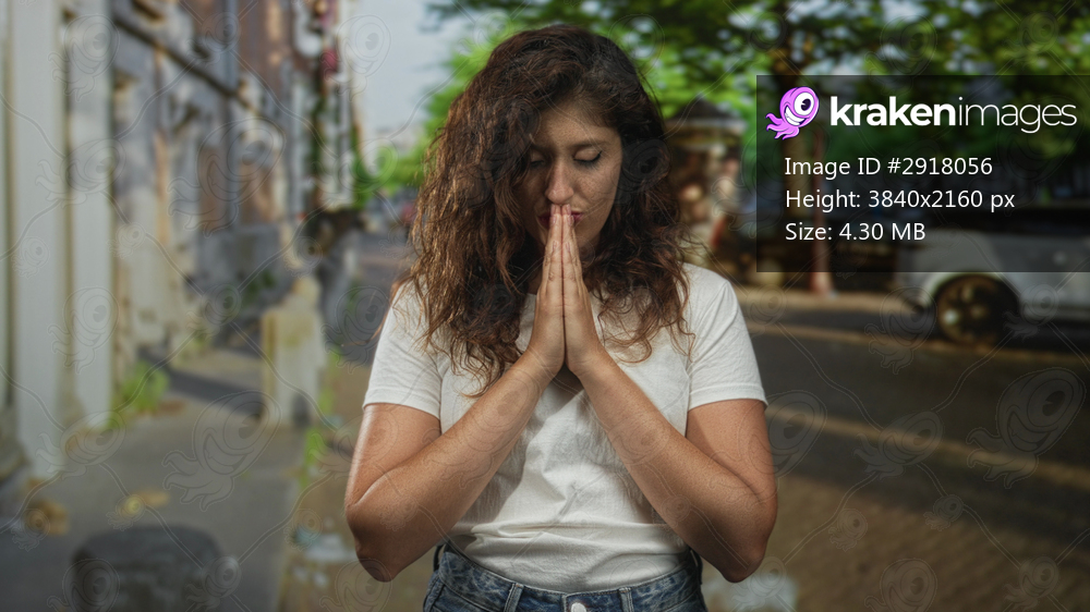 Young hispanic woman in a white t shirt with hands pressed together praying on a cobbled city street; serenity reflection prayer.
