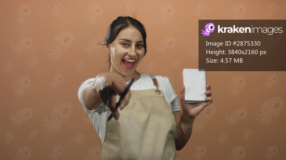 Young hispanic woman in apron holding a notepad and pen while pointing finger toward camera in peach studio; cheerful service.