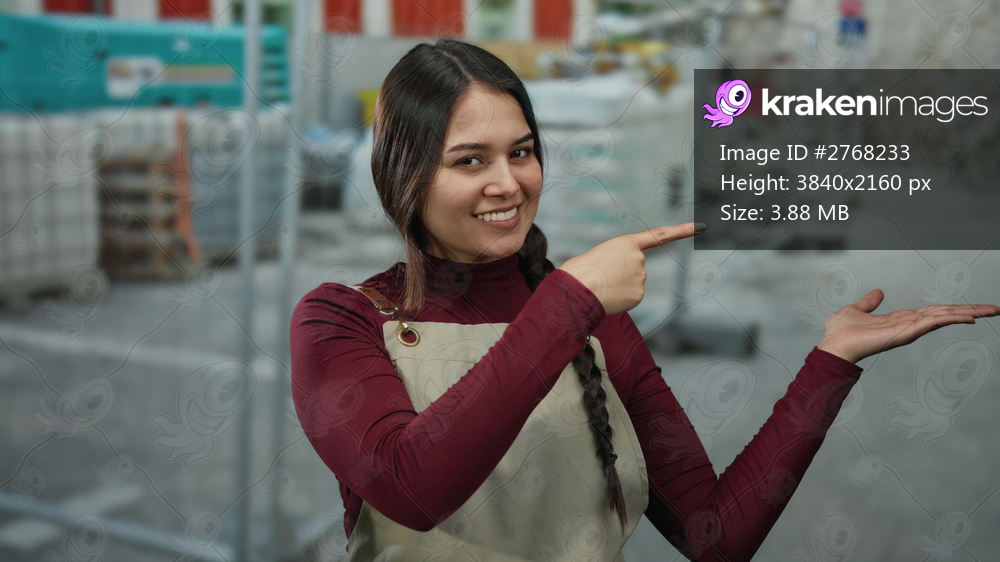 Young hispanic woman in apron pointing at construction site outdoors highlighting her waitress role and setting in a unique scene blending hospitality with construction. - Kraken Images