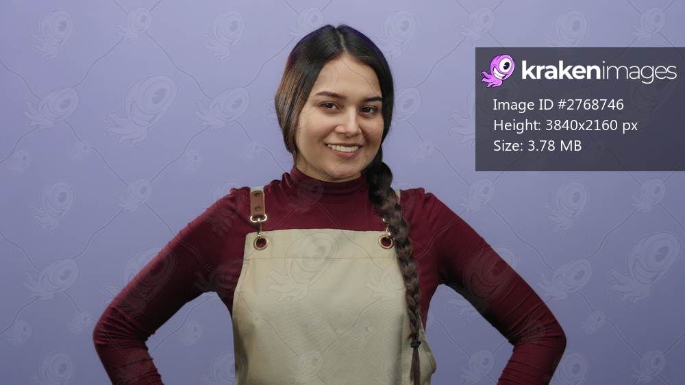 Young hispanic woman in apron standing confidently over isolated purple background, embodying traits of a friendly and approachable waitress.