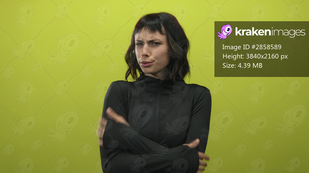 Young hispanic woman in athletic sportswear shivers hugging arms with eyes closed in green studio; discomfort.