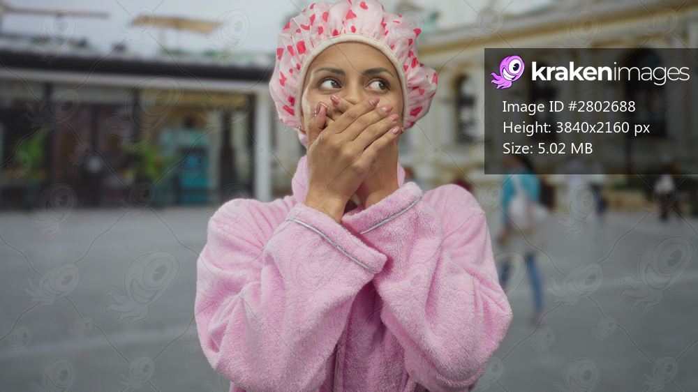 Young hispanic woman in bathrobe outdoors on a busy street, smiling with shower cap on, reflecting a unique urban moment.