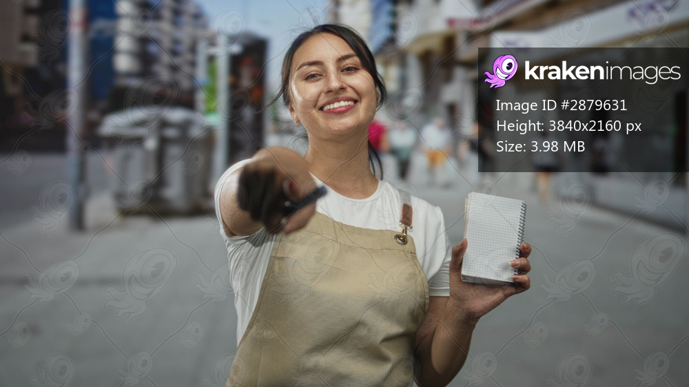 Young hispanic woman in beige apron points finger toward camera on a busy city street holding a spiral notebook and pen; friendly invitation.