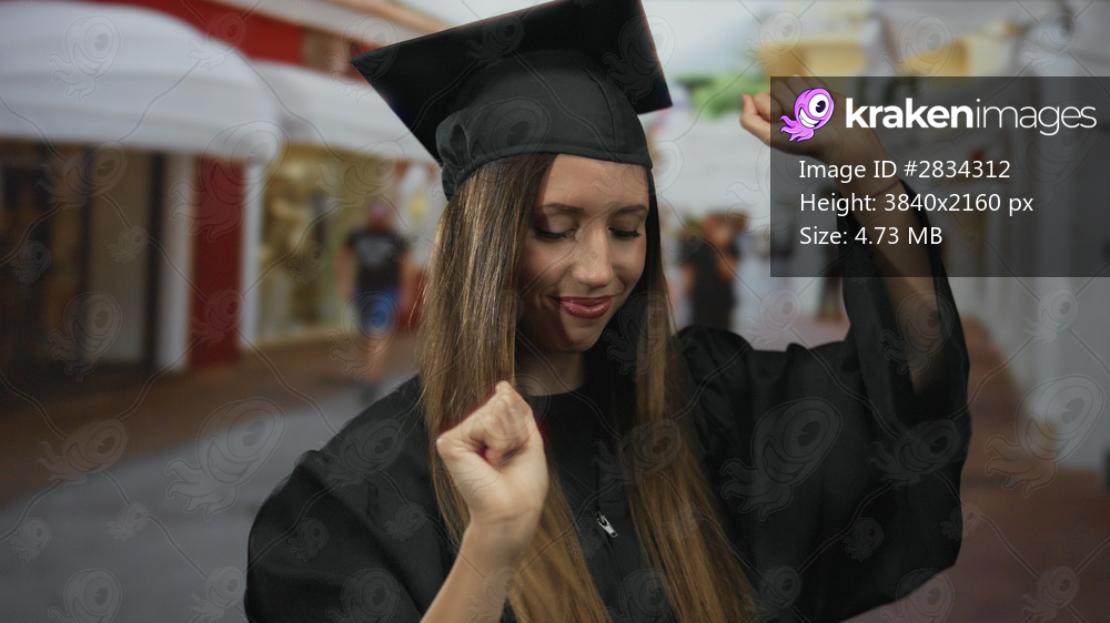 Young hispanic woman in black graduation gown dancing with raised arms and smiling on street; success joy.