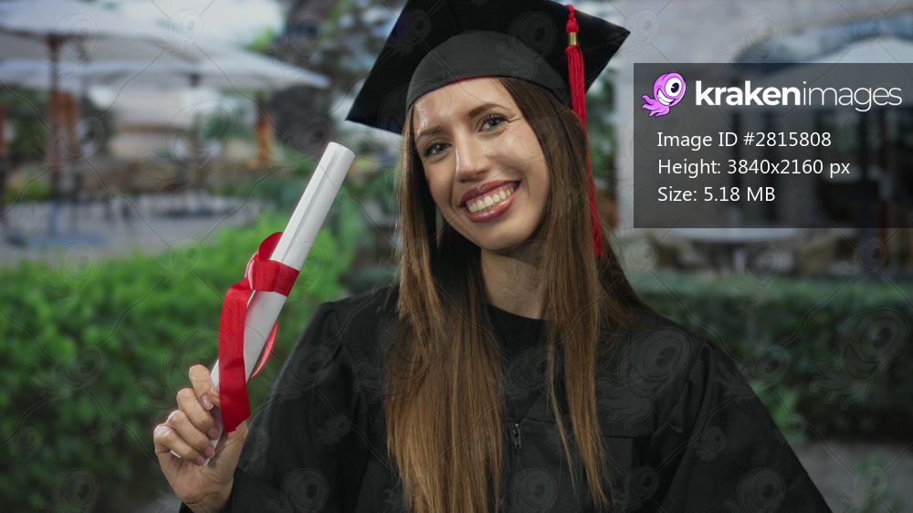 Young hispanic woman in black graduation gown holds diploma on building terrace and smiles into camera; pride.