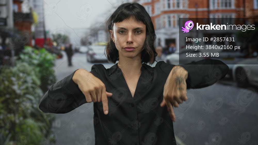Young hispanic woman in black shirt points finger downward on busy city street lined with cars and brick buildings; direction focus.