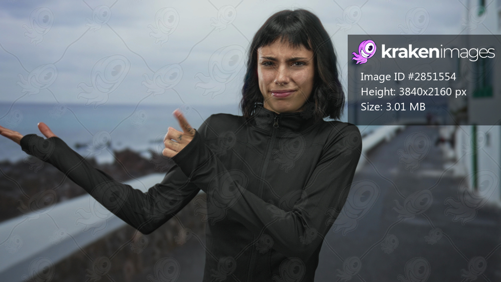 Young hispanic woman in black sportswear extends hands to the side on a street with a slight shrug; casual confidence openness relaxation.