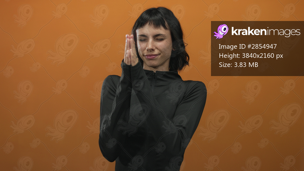 Young hispanic woman in black sportswear pressing bare hands together in studio session; serenity mindfulness.