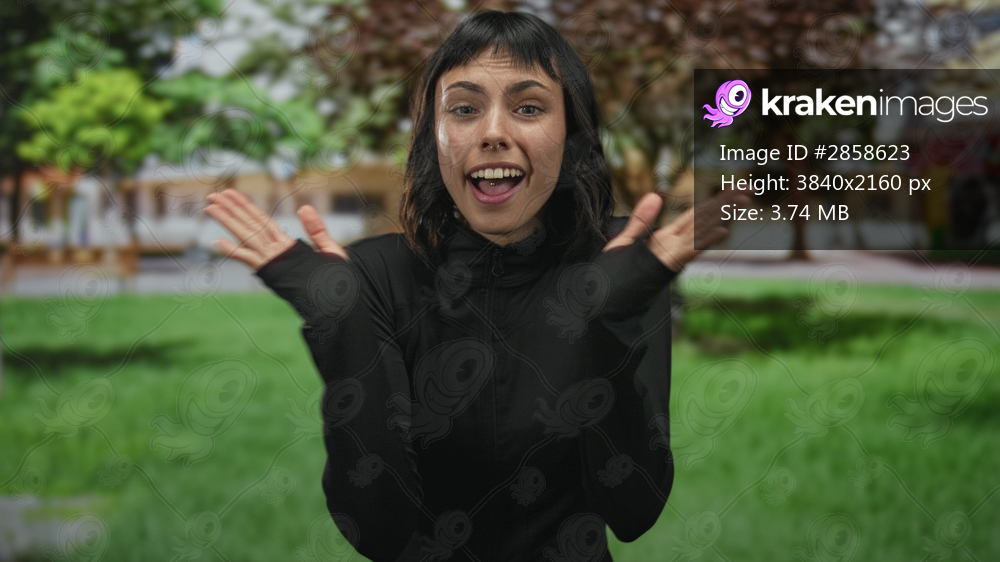 Young hispanic woman in black sportwear clapping hands outside near a building facade under natural sunlight; joy.