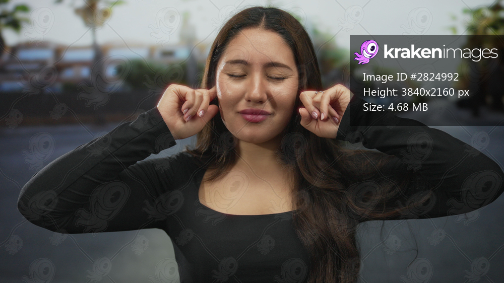 Young hispanic woman in black top covers ears on busy city street with blurred traffic and buildings behind her; discomfort.