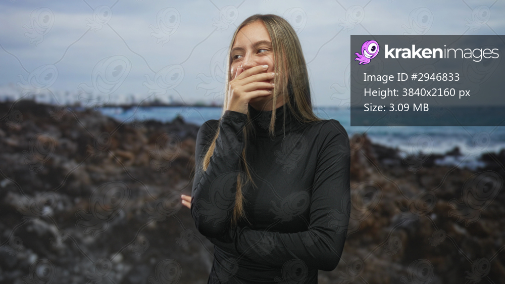 Young hispanic woman in black turtleneck laughing with hand covering mouth and crossed arms on a rocky beach shoreline with ocean waves visible; playful joy. - Kraken Images