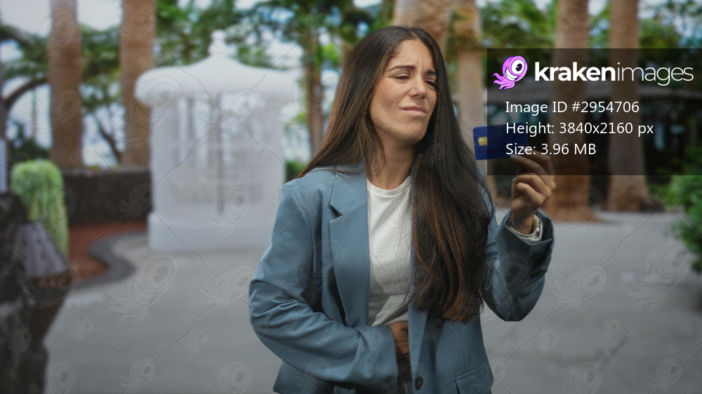 Young hispanic woman in blazer holding creditcard up on street, grimacing and clutching stomach; financial worry.