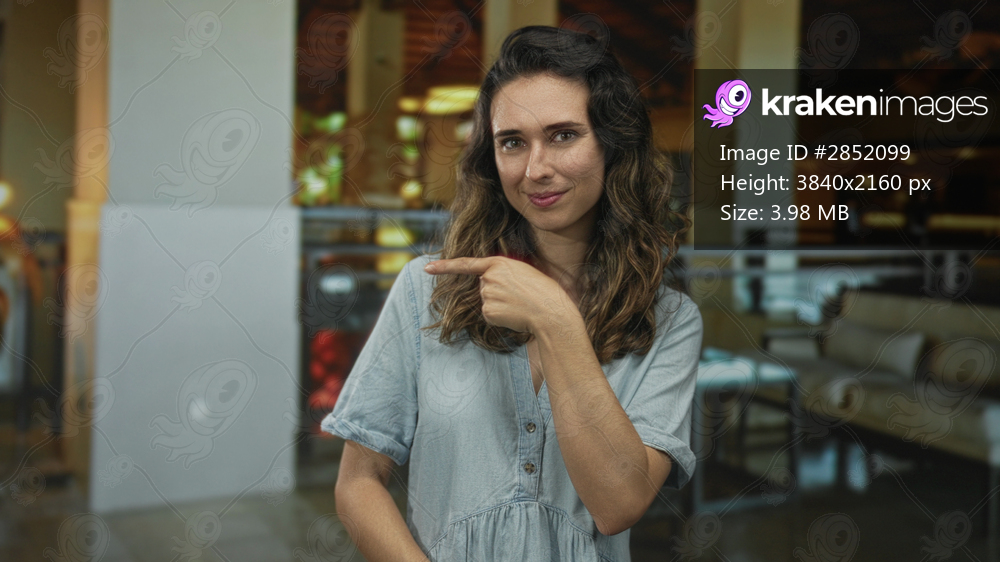 Young hispanic woman in blue denim dress finger to lips for silence in hotel building lobby with gentle smile; playfulness.
