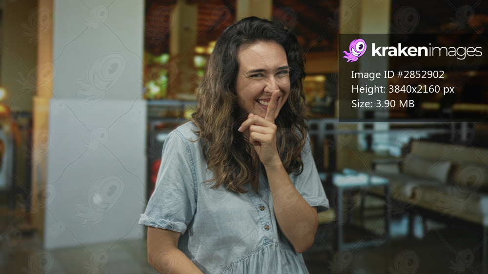 Young hispanic woman in blue denim dress finger to lips for silence in hotel building lobby with gentle smile; playfulness.