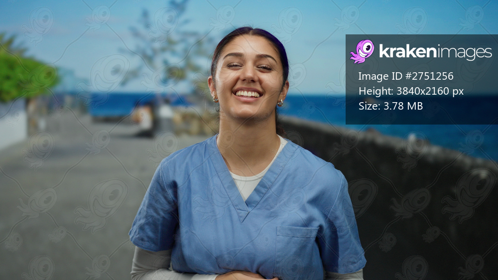 Young hispanic woman in blue scrubs laughs on a seaside promenade with ocean backdrop depicting relaxed healthcare professional.