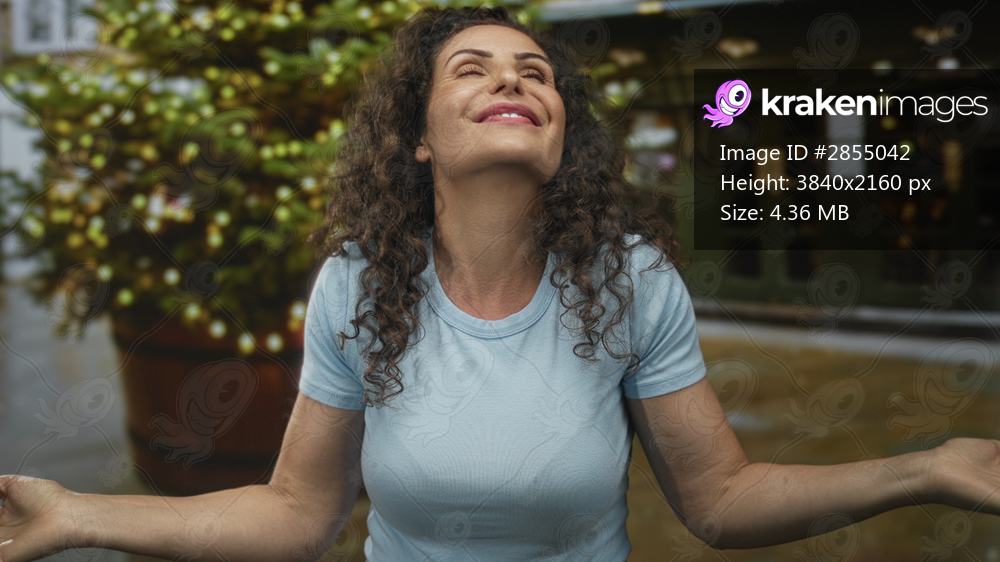 Young hispanic woman in blue shirt gently blows kiss with both hands on sunlit street; affection love.