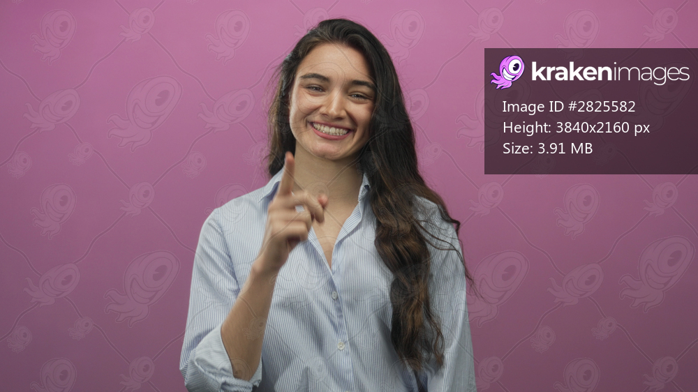 Young hispanic woman in blue striped shirt smiling and pointing finger in pink studio; confidence engagement motivation.