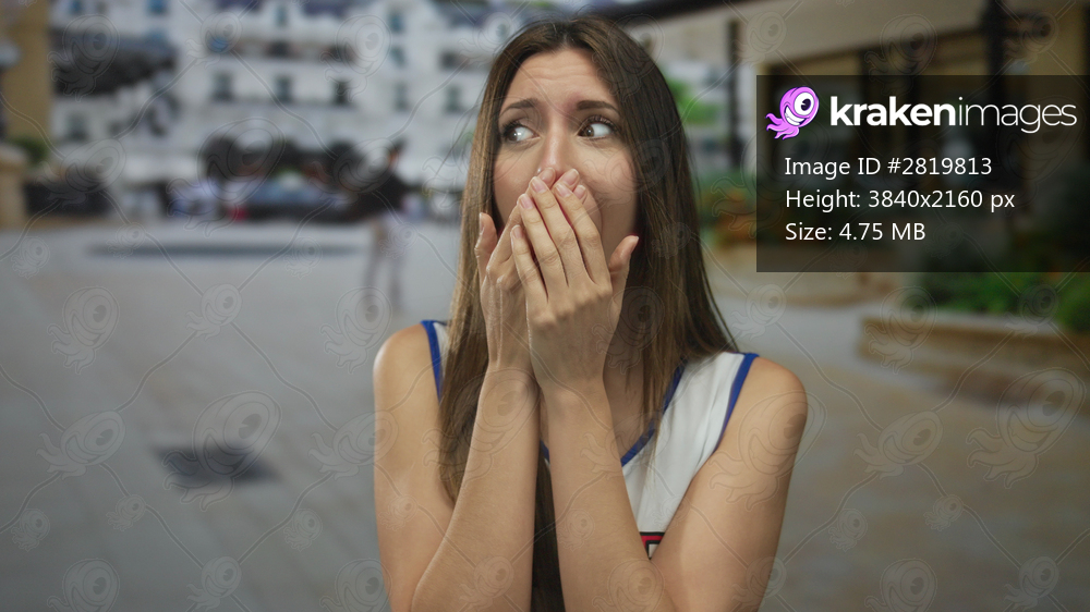 Young hispanic woman in cheerleader uniform covering mouth with both hands on street near building facade; surprise.