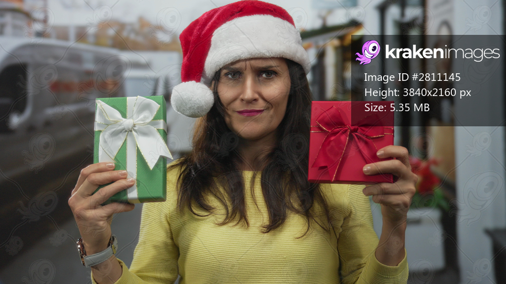 Young hispanic woman in christmas hat holding gifts on a city street, showcasing holiday spirit outdoors with vibrant boxes and joyful expression.