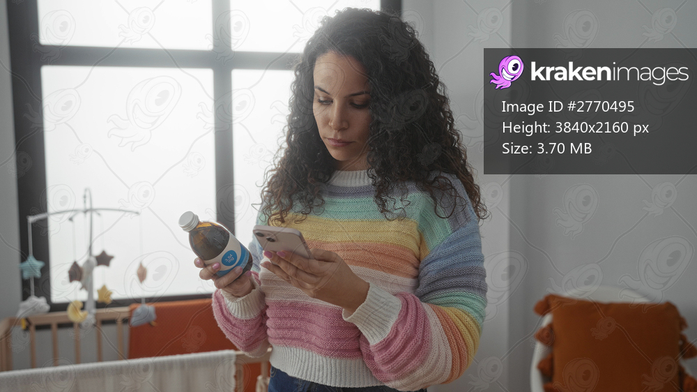 Young hispanic woman in colorful sweater holding phone and bottle in bedroom with baby crib and decor.