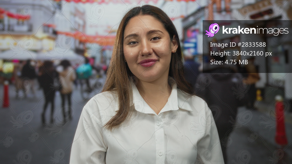 Young hispanic woman in crisp white shirt tucks hair behind ear on busy city street under red lantern decorations; serenity.
