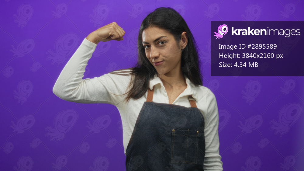 Young hispanic woman in denim apron flexing bicep and fist in purple studio; strength confidence empowerment poise.