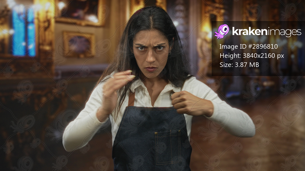 Young hispanic woman in denim apron with hands on hips and stern frown standing in museum building gallery; frustration determination.