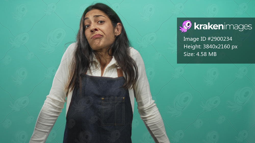 Young hispanic woman in denim apron shrugs shoulders in studio with turquoise backdrop; uncertainty.