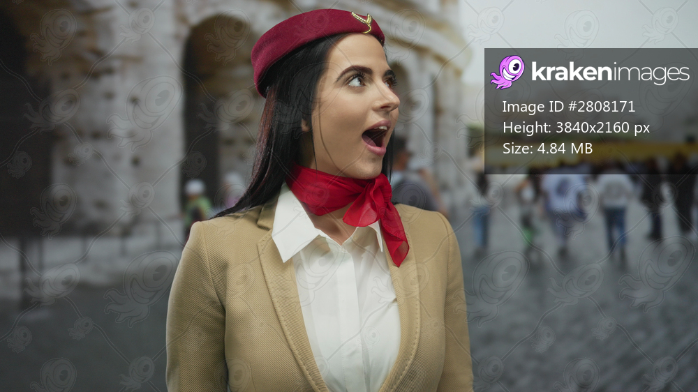 Young hispanic woman in flight attendant uniform amazed outside roman coliseum on bustling street showcasing unique urban and historic blend.