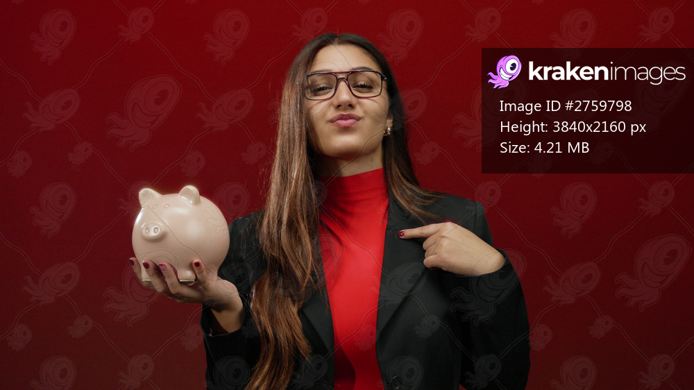 Young hispanic woman in glasses holds piggy bank against vibrant red background, confidently pointing to herself, embodying themes of finance and self-reliance. - Kraken Images