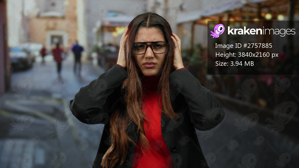 Young hispanic woman in glasses looks stressed on a vibrant city street with outdoor dining and blurred pedestrians.