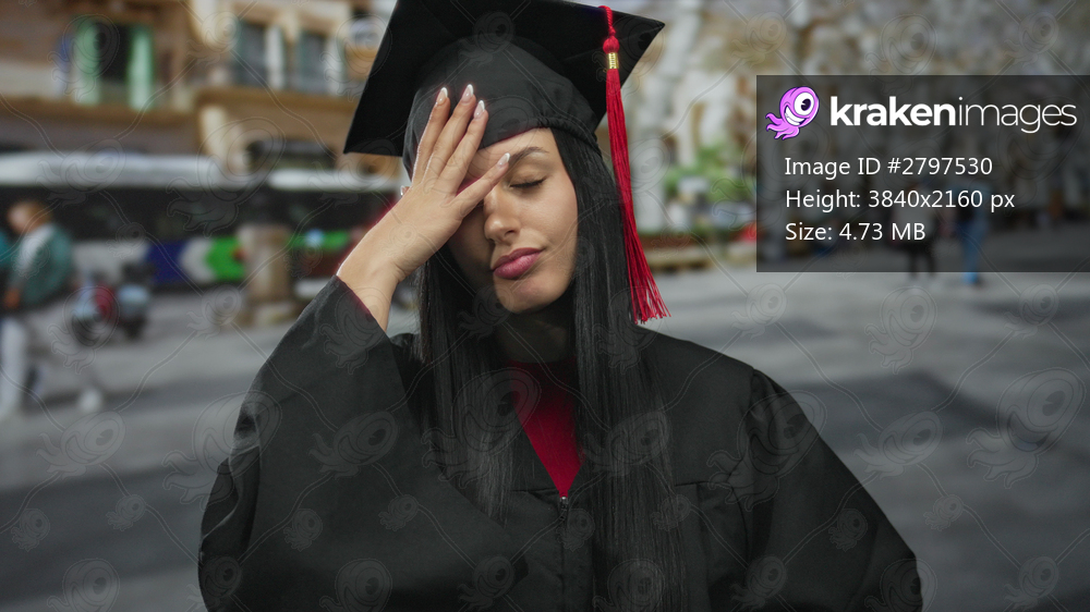 Young hispanic woman in graduation attire standing on a city street outdoors, looking concerned, with a blurred urban background, symbolizing achievement and uncertainty. - Kraken Images